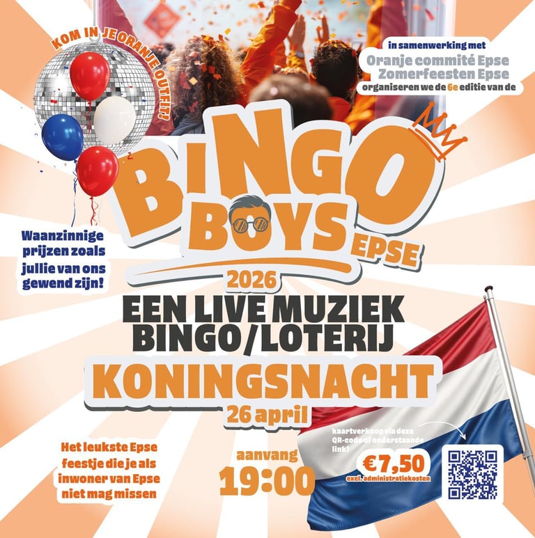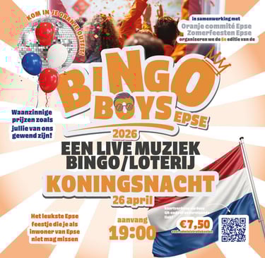 Ook in 2026 zijn de Bingo Boys Epse weer terug met een spetterende editie die je absoluut niet wilt missen! Na het geweldige jubileum van vorig jaar zetten ze ook dit jaar weer een fantastische avond neer vol gezelligheid, humor en natuurlijk… fantastische prijzen!